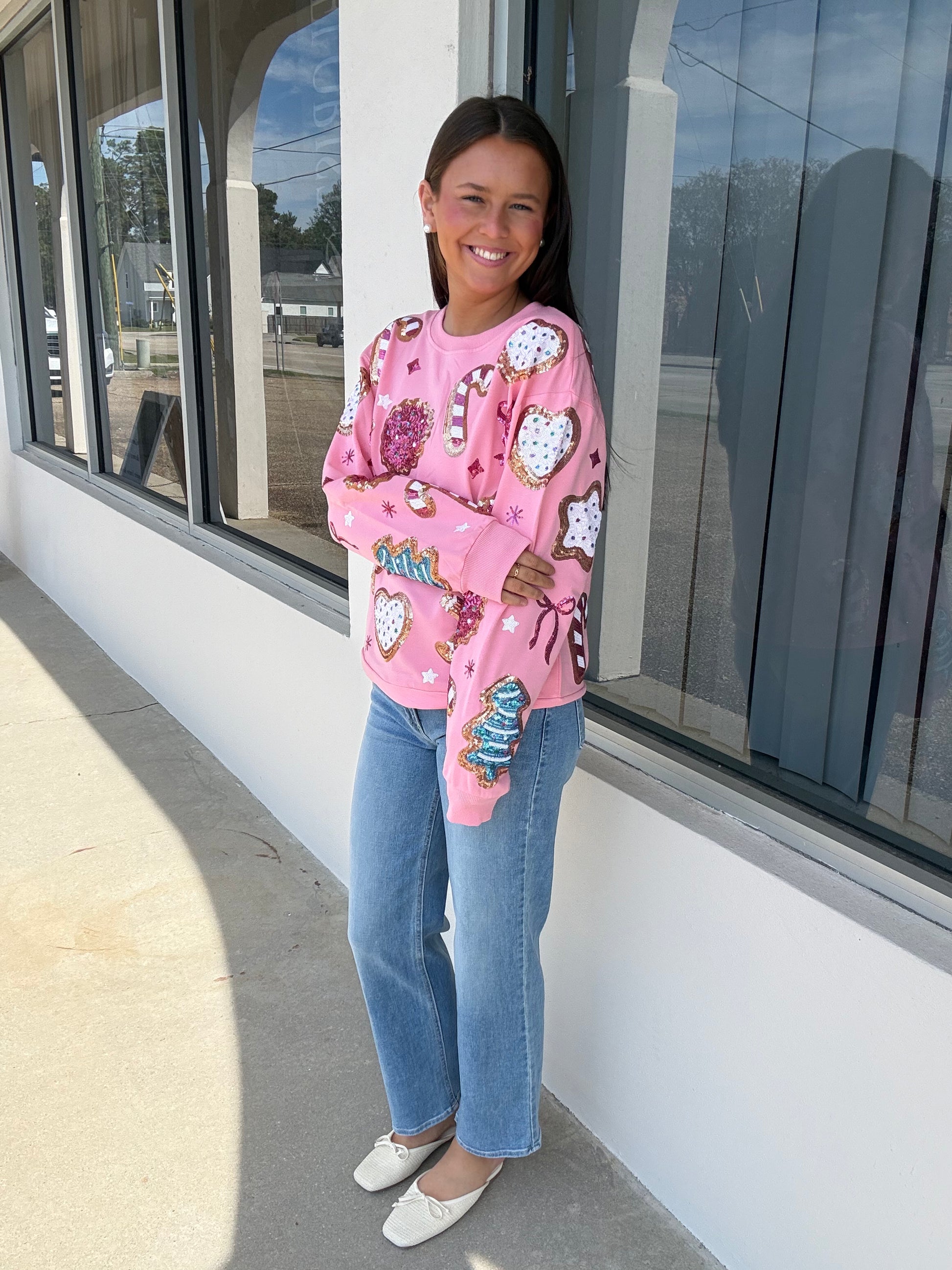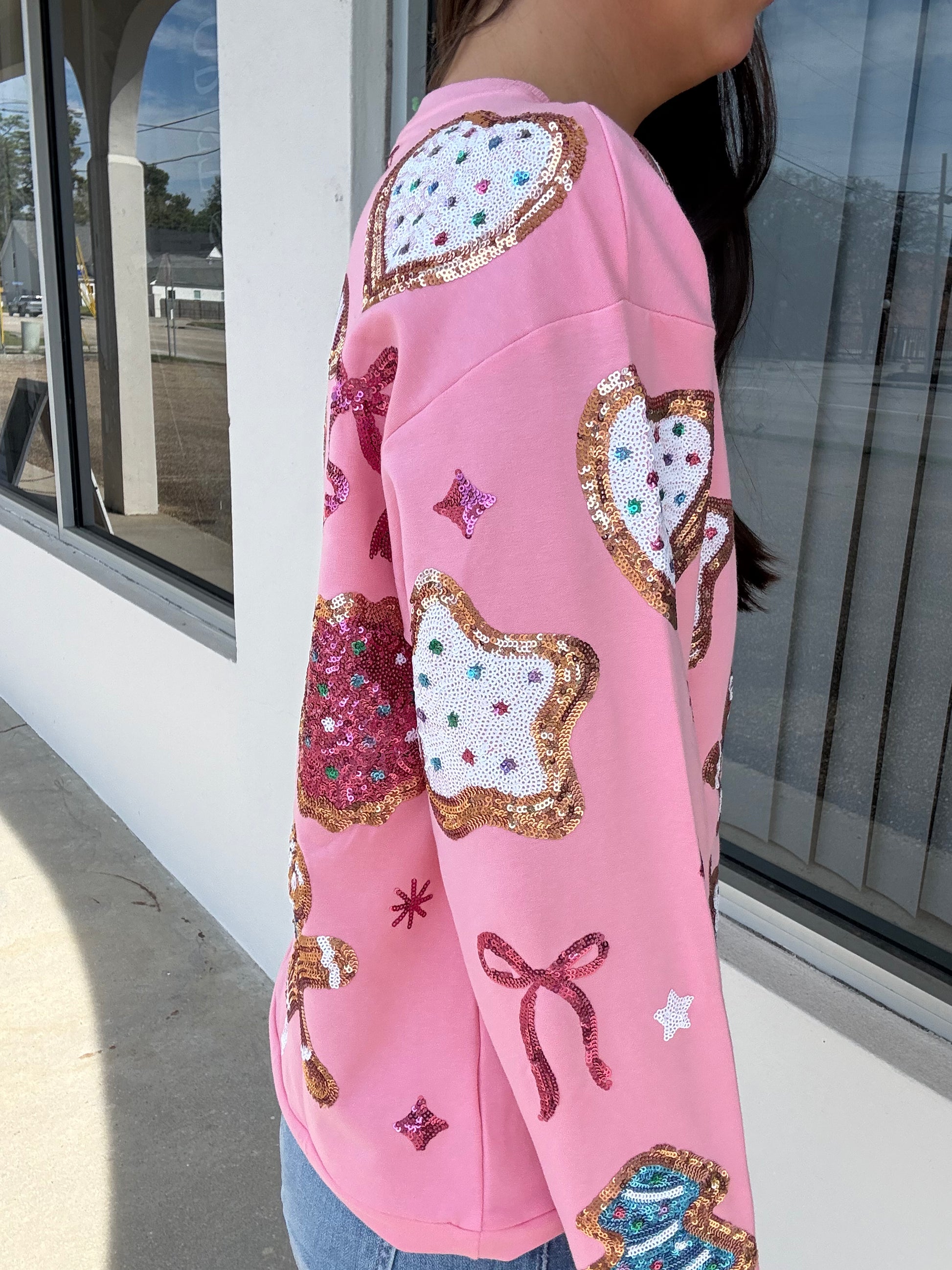 Celebrate the season in style with this festive Belle Cher Christmas Cookies Sweatshirt. Adorned with shimmering sequins and sparkles, this playful pink pullover brings holiday cheer to your wardrobe. Perfect for cozy nights by the fire or festive gatherings, it captures the magic of Christmas with its charming cookies and milk design. Whether you're a holiday enthusiast or looking for a fun statement piece, this sweatshirt lets you spread seasonal joy with confidence and sparkle.