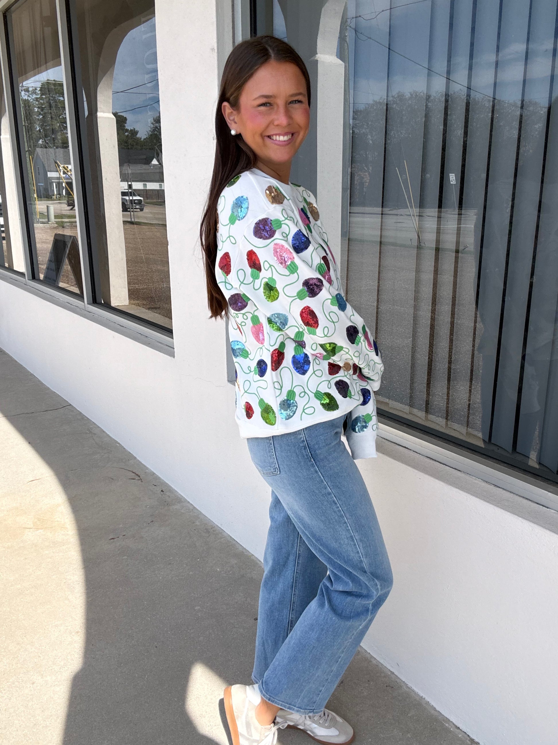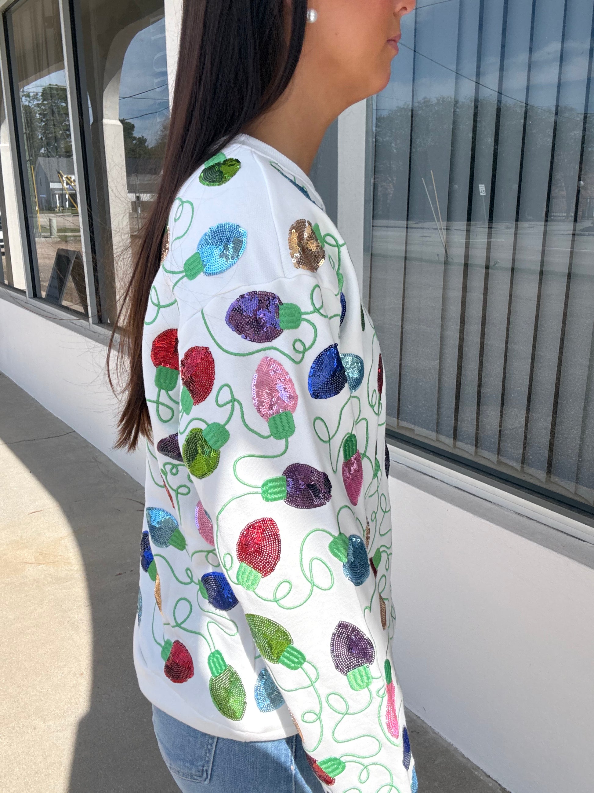 Celebrate the season in style with the Belle Cher Christmas Lights Sweatshirt. This festive piece features shimmering sequins and sparkly details that capture the magic of holiday lights, making it perfect for spreading cheer at seasonal gatherings, cozy nights in, or casual holiday outings. The comfortable sweatshirt design keeps you warm while the eye-catching embellishments add a touch of glamour to your winter wardrobe. Embrace the joy of the holidays with this delightful seasonal essential.