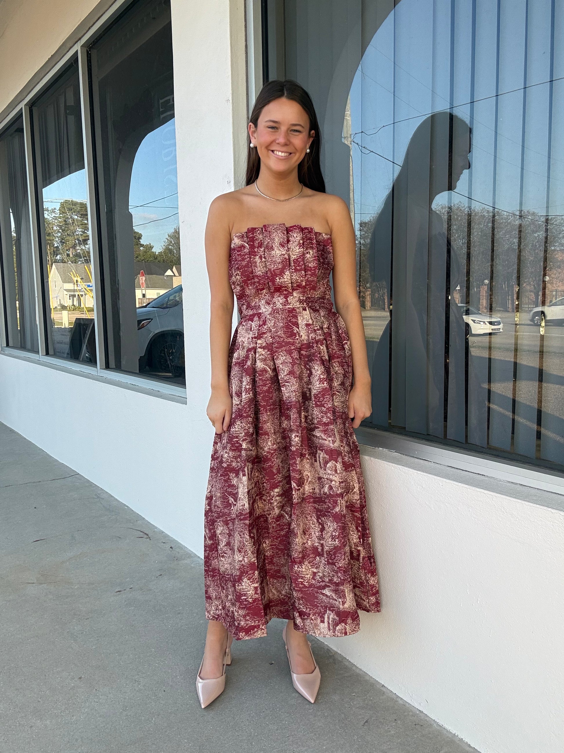 Elevate your holiday wardrobe with this stunning burgundy and gold toile midi dress. The elegant strapless design offers a sophisticated silhouette perfect for cocktail parties, festive gatherings, and special occasions. The rich burgundy hue paired with intricate gold detailing creates a timeless look that transitions beautifully from evening events to upscale celebrations. This versatile piece is designed to make you feel confident and radiant, whether you're attending a holiday soirée or a formal dinner. A true wardrobe essential for anyone seeking polished, occasion-ready style.