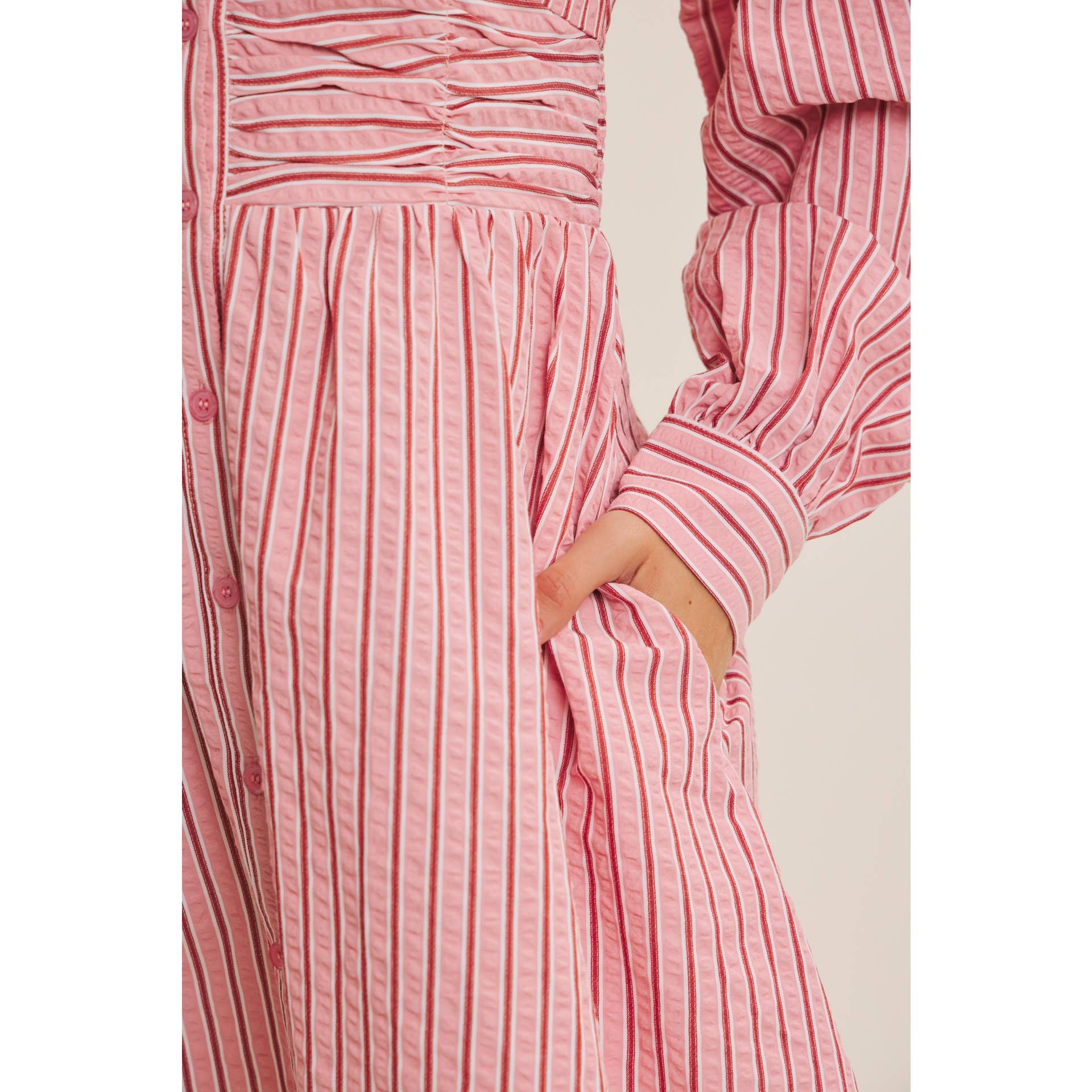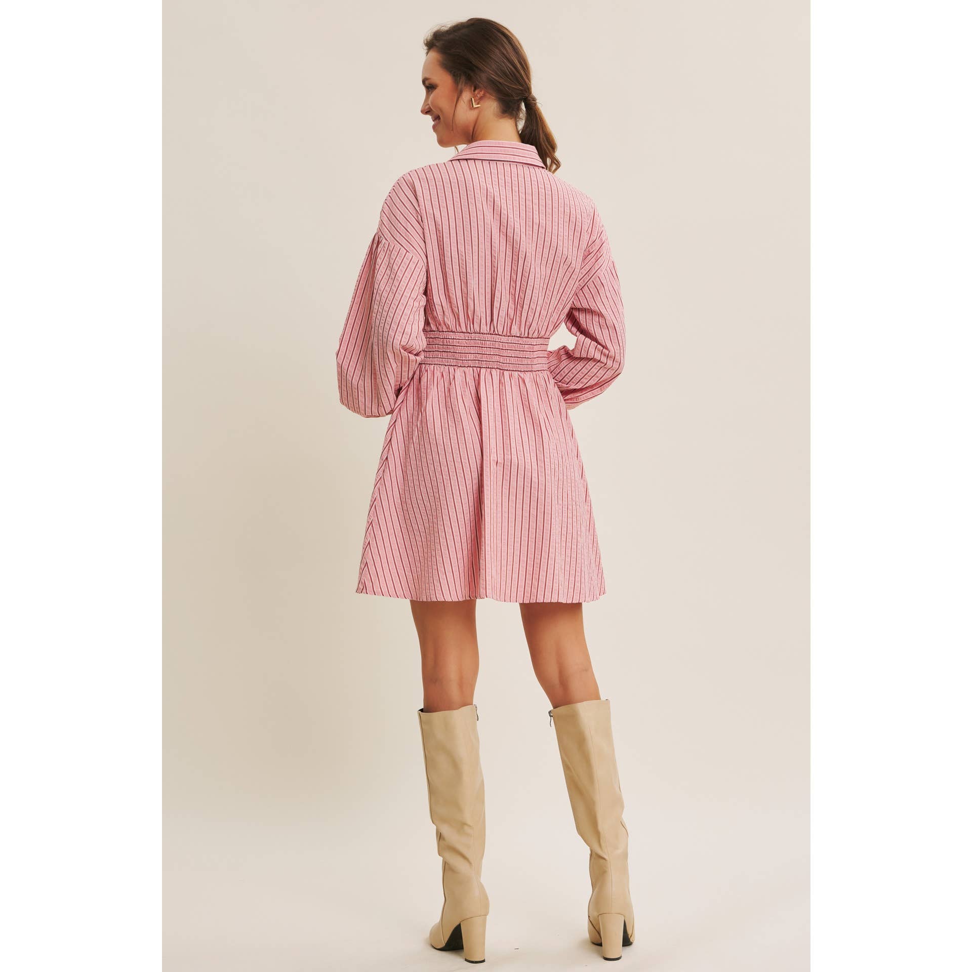 Brighten your wardrobe with this cheerful stripe textured ruched button-down mini dress. The flattering ruching detail enhances your silhouette, while the vibrant stripes add a burst of positivity to your look. Perfect for casual outings or sunny days, its button-down front offers easy wear and a touch of classic charm. Enjoy comfort and style combined in one playful, supportive dress that lifts your spirit with every wear.