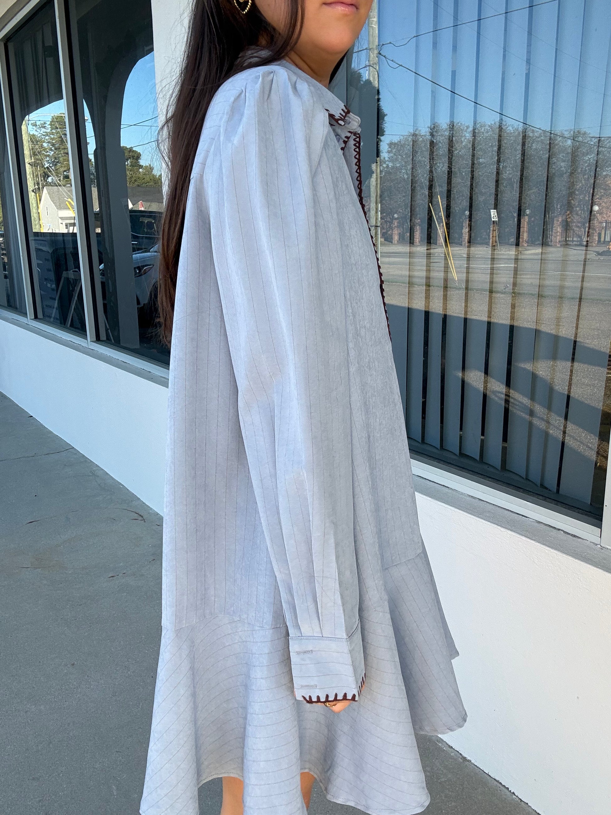 Embrace effortless style with this Dusty Blue Stripe Dress, designed to work beautifully with your wardrobe. Long sleeves make it perfect for layering through seasons, while the thoughtfully crafted silhouette flatters every body type. Whether you're dressing it up for a special occasion or keeping it casual for everyday wear, this versatile piece adapts to your needs. The soft dusty blue palette with subtle stripes adds visual interest without overwhelming your look. A wardrobe essential that celebrates you, exactly as you are.