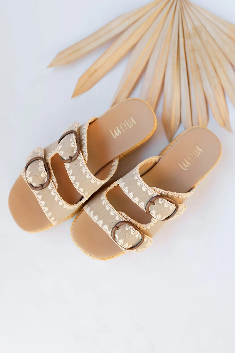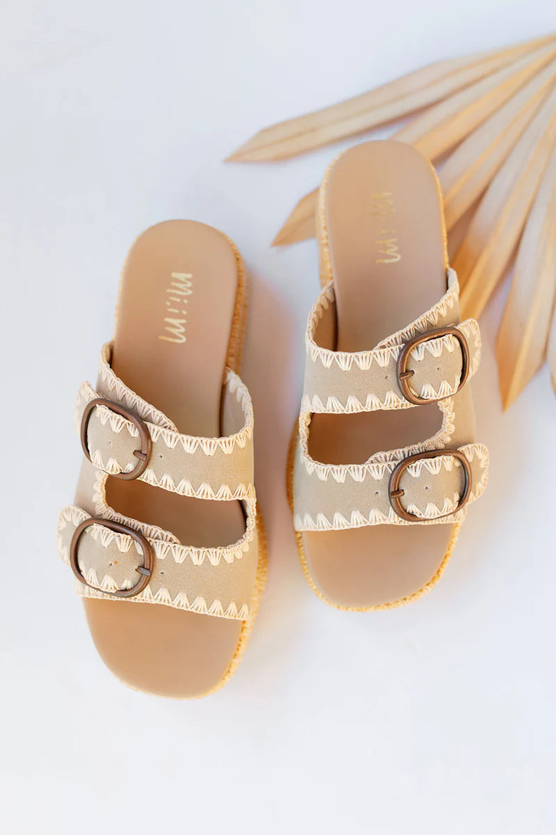 Slip into style with these Slide-On Beige Platform Sandals. The stitch detail adds a touch of uniqueness to these sandals, making them perfect for any outfit. Elevate your look and stay comfortable with the added height of the platform. Perfect for the fashion-forward, yet laid-back individual.